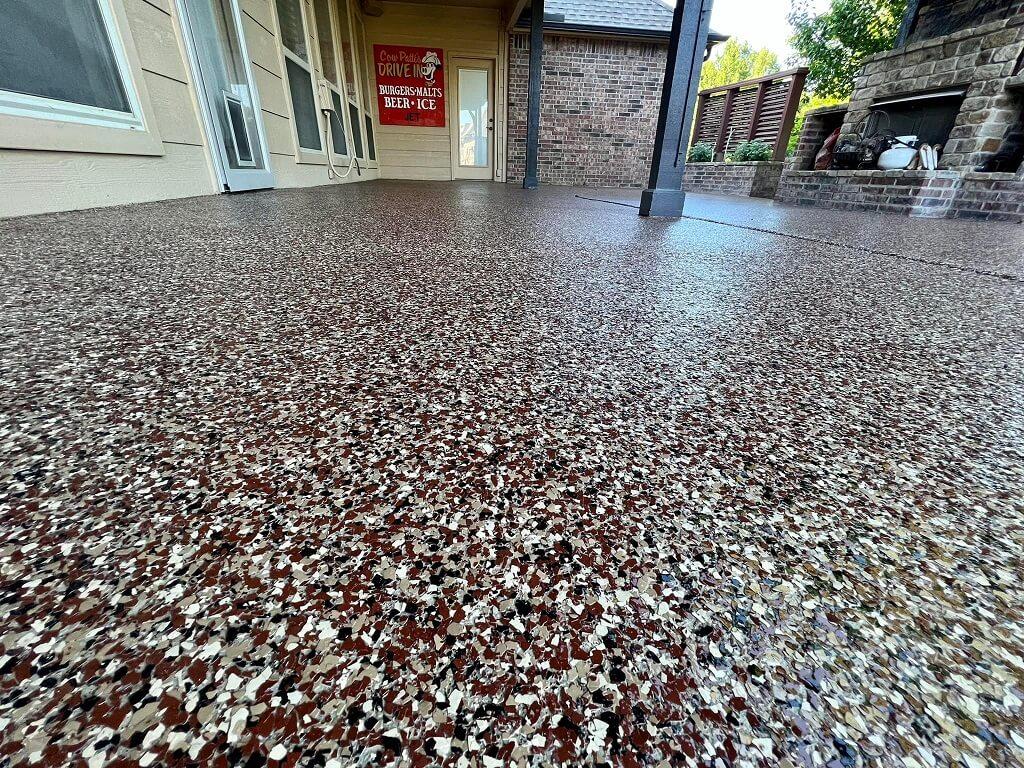 Got any old, cracked, or worn concrete? Contact us for limitless chip epoxy coating possibilities for your concrete floors at home!